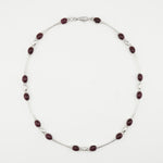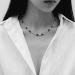 The Celine Necklace is a modern bar link choker in polished sterling silver, featuring 6x8mm cabochon stones hand set at each end of every link. Each link is individually cast and polished before the stones are carefully placed, creating a refined, handcrafted finish. At 16" in length, it sits perfectly at the collarbone for a sleek, contemporary look.